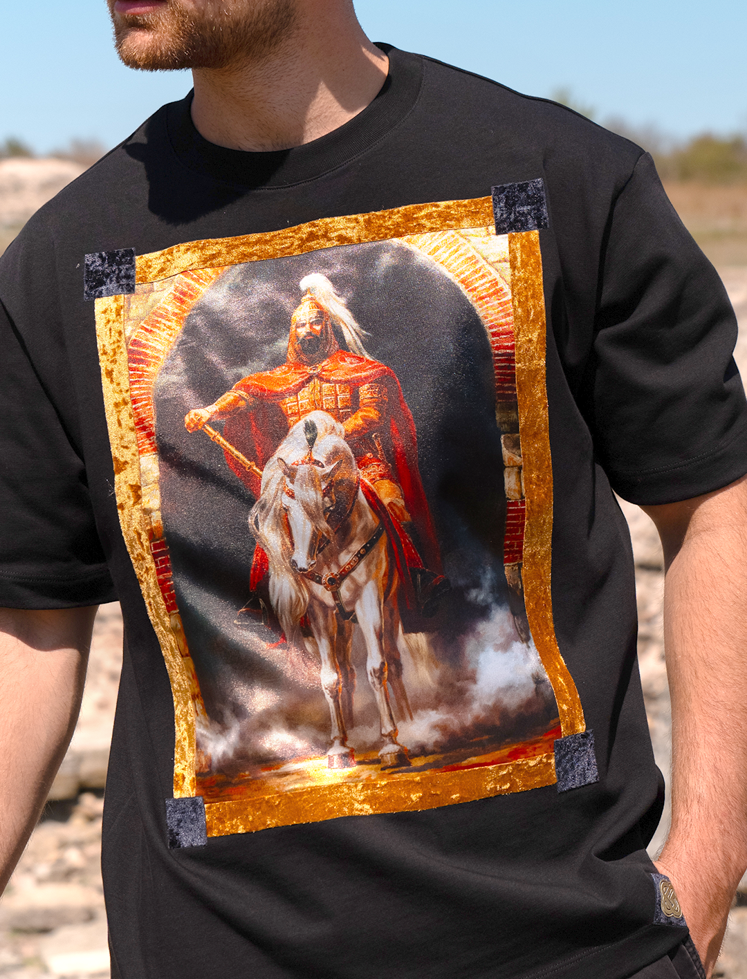Визуалният акцент в тениската е вдъхновен от образа на Хан Тервел – владетелят, който остава в историята като спасителя на Константинопол. Той е един от онези, които поставят граници пред арабската експанзия в Европа. Тервел е герой, който често е припознат от любители на историята и хора, за които родолюбието е въпрос на чест. Неговият лик върху дреха е естетика и символ на памет, сила и самочувствие.
