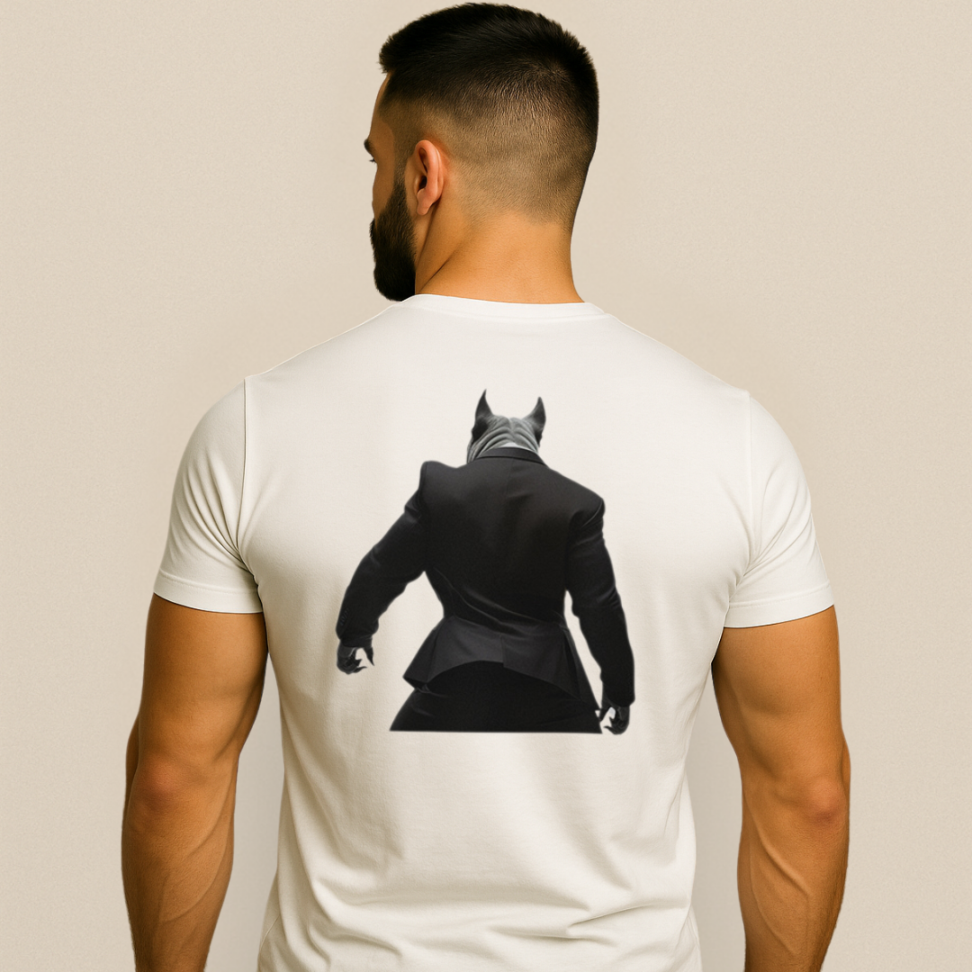 ✔ Финални детайли: Минималистичен фон, преден изглед на животното отпред и заден изглед на гърба на тениската.